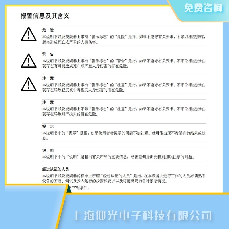 本說明書以及變頻器上帶有“警示標(biāo)志”的“警告”是指:如果不遵守有關(guān)要求,不采取相應(yīng)措施,